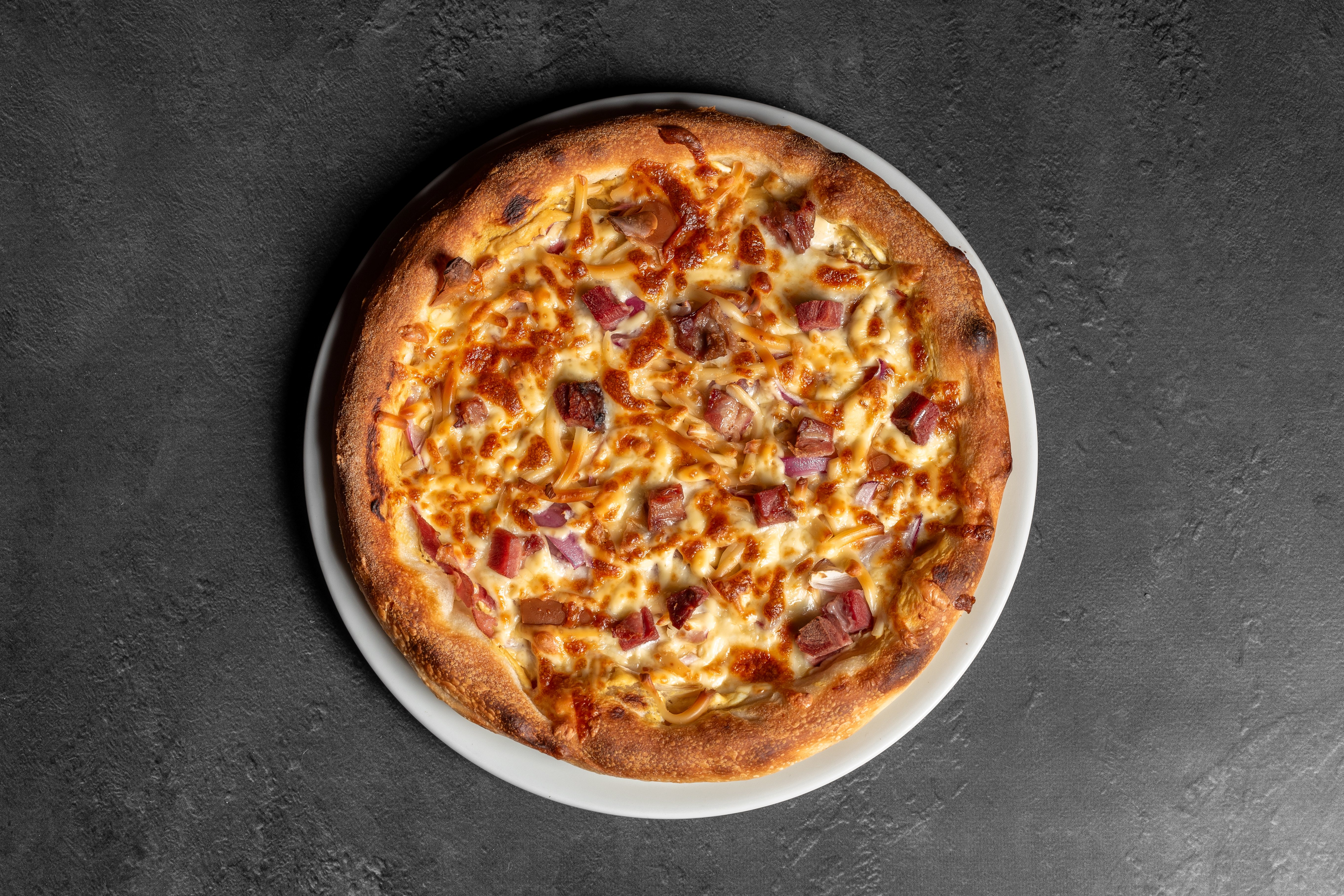 Texas (BBQ alap, csirkemell csíkok, sajt, lilahagyma, tarja, bacon)
